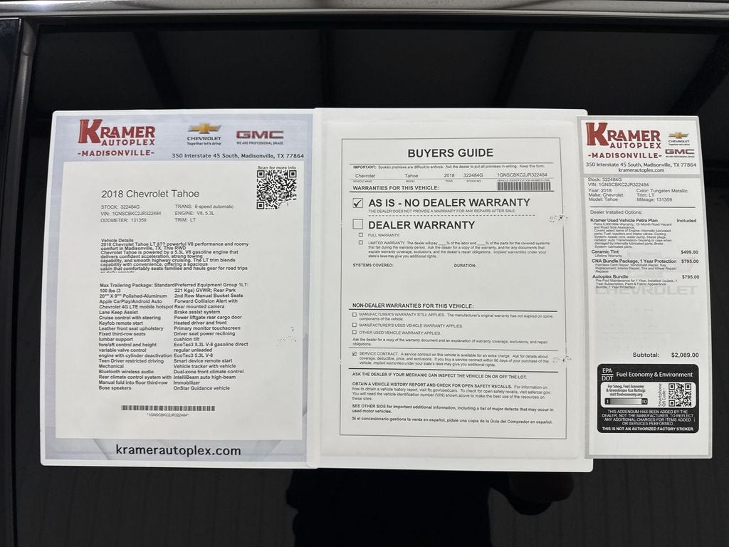 Power, comfort, and value come together in this 2018 Chevrolet Tahoe LT with rear-wheel drive and the proven 5.3L V8 gasoline engine. Located in Madisonville, TX, this Chevrolet Tahoe delivers strong highway performance and confident towing capability while remaining comfortable for daily driving. The well-appointed LT package includes premium leather seats and a Bose stereo system for an elevated in-cabin experience on every trip.