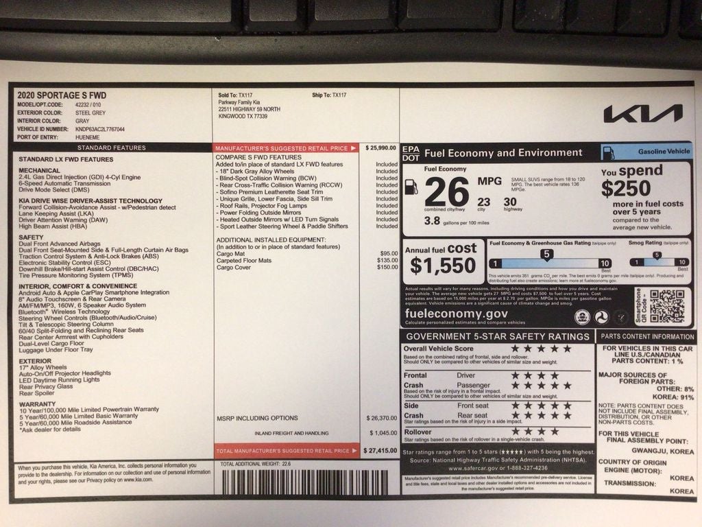 This small suv offers Android Auto for seamless smartphone integration. Apple CarPlay: Seamless smartphone integration for this unit - stay connected and entertained on the go! Bluetooth® technology is built into this small suv, keeping your hands on the steering wheel and your focus on the road. Protect this vehicle from unwanted accidents with a cutting edge backup camera system. This small suv has a clean CARFAX vehicle history report. The leather seats in this 2020 Kia Sportage are a must for buyers looking for comfort, durability, and style. The vehicle emanates grace with its stylish gray exterior. This small suv has a 4 Cyl, 2.4L high output engine. Maintaining a stable interior temperature in this unit is easy with the climate control system. It is front wheel drive. The Kia Sportage features cruise control for long trips. The high efficiency automatic transmission shifts smoothly and allows you to relax while driving.