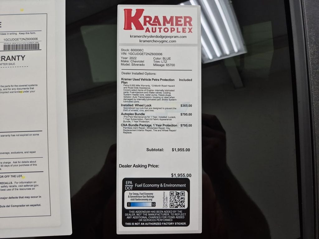 LTZ Convenience Package II: 2nd Row Heated Outboard Seats; Power Sliding Rear Window with Rear Defogger; Universal Home Remote; Adaptive Cruise Control. Z71 Off-Road and Protection Package: Chevytec Spray-On Black Bedliner; All-Weather Floor Liner. Z71 Off-Road Package: 2-Speed Transfer Case; Hill Descent Control; Dual Exhaust with Polished Outlets; Off-Road Suspension; Skid Plates; Heavy-Duty Air Filter. LTZ Premium Package: Power Sunroof. Technology Package: 15" Diagonal Multicolor Head-Up Display; Bed View Camera; Rear Camera Mirror. Preferred Equipment Group 1LZ: Driver Memory; SiriusXM with 360L; Electric Rear-Window Defogger; Theft Deterrent System (unauthorized Entry); Front Rainsensing Wipers; Compass; Heated Steering Wheel; 120-Volt Instrument Panel Power Outlet; Heated Driver and Front Outboard Passenger Seats; Color-Keyed Carpeting Floor Covering; OnStar and Chevrolet Connected Services Capable; Front Rubberized Vinyl Floor Mats; Rear Rubberized-Vinyl Floor Mats; Power Front Passenger Windows with Express Up/down; 12.3" Multicolor Reconfigurable Digital Display; Chrome Mirror Caps; Power Rear Windows with Express Down; Integrated Trailer Brake Controller; Single-Speed Transfer Case; Leather Wrapped Steering Wheel; Front Frame-Mounted Black Recovery Hooks; Keyless Open and Start; Auto-Dimming Inside Rearview Mirror; LED Cargo Area Lighting; Bluetooth® For Phone; Remote Vehicle Starter System; Trailering App; LTZ Plus Package; Trailering Package; Electrical Steering Column Lock; Wireless Phone Projection; Up-Level Rear Seat with Storage Package; Standard Tailgate; Front LED Fog Lamps; Steering Wheel Audio Controls; Dual Rear USB Ports (charge Only); Deep-Tinted Glass; 10-Way Power Driver Seat with Lumbar; Electronic Cruise Control; Chevy Safety Assist; Hitch Guidance with Hitch View; Power Front Windows with Driver Express Up/down; Power Tailgate; 10-Way Power Passenger Seat Adjuster with Lumbar; Outside Heated Power-Adjustable Mirrors; Rear Wheelhouse Liners; Auto-Locking Rear Differential. Power Sunroof. Chrome Assist Steps. Chevytec Spray-On Black Bedliner. All-Weather Floor Liner. 275/60R20SL AT BW Tires. **Equipment listed is based on original vehicle build and subject to change. Please confirm the accuracy of the included equipment by calling the dealer prior to purchase.**