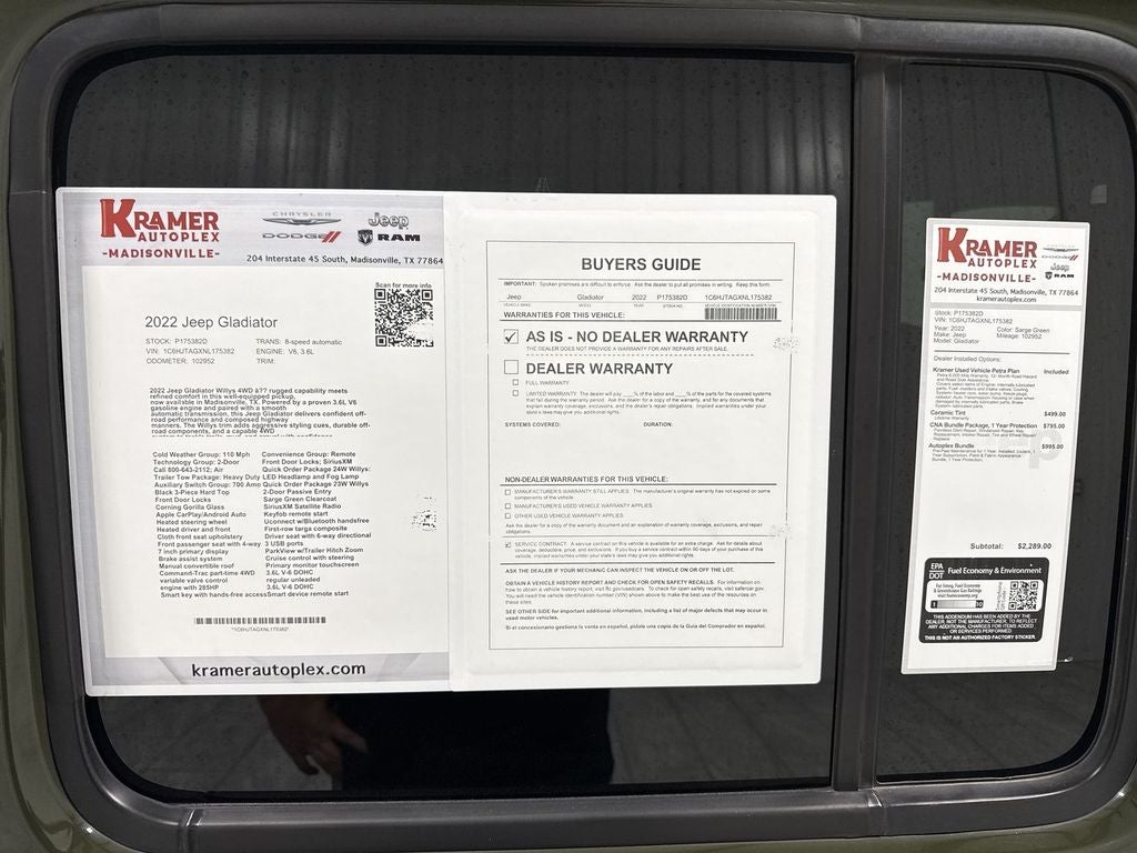 This Jeep carries the best price in the area — a great value for buyers seeking capability, comfort, and style. Located in Madisonville, TX, the vehicle is ready for test drives and local delivery. Whether you're outfitting a weekend warrior or upgrading to a more versatile work truck, this 2022 Jeep Gladiator Willys offers an appealing blend of toughness and convenience. Contact us to schedule a viewing and drive home confident in your purchase.