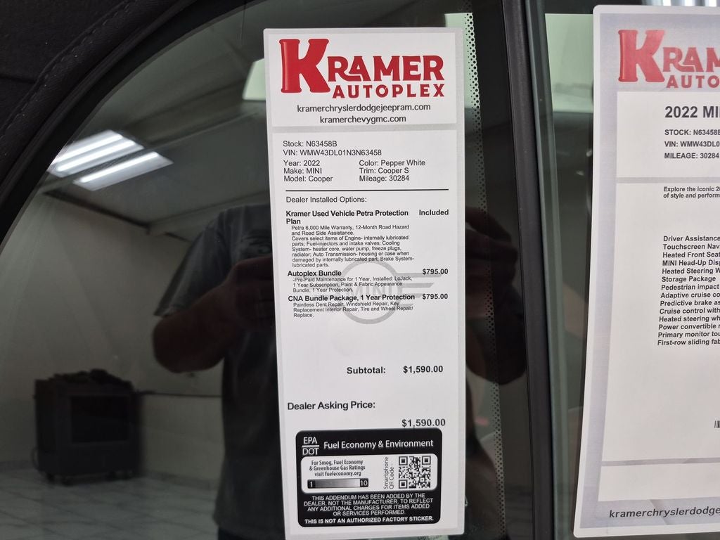 Driver Assistance Package: Parking Assistant; Active Cruise Control. Iconic Trim: 7-Speed Sport Dual Clutch Transmission; Storage Package; Heated Front Seats; Convertible Wind Deflector; Auto-Dimming Rearview Mirror; Comfort Access Keyless Entry; Harman/kardon Premium Sound System; Body Color Mirror Caps; Power-Folding Mirrors; 18" X 8.0" MINI Yours British Spoke 2-Tone Wheels; Heated Steering Wheel; Dual Zone Auto Climate Control; Universal Garage-Door Opener; Nappa Leather Steering Wheel; All-Season Tires. Touchscreen Navigation Plus: ConnectedDrive Services; Media Display; Dynamic Digital Instrument Cluster; Advanced Real-Time Traffic Information; Concierge Services; Apple CarPlay Compatibility; Remote Services; MINI Navigation; MINI Connected; MINI Assist ECall; MINI Head-Up Display; MINI TeleServices; MINI Connected XL; Wireless Charging. Harman/kardon Premium Sound System. Heated Front Seats. Parking Assistant. MINI Head-Up Display. Pepper White. Heated Steering Wheel. Universal Garage-Door Opener. Storage Package. **Equipment listed is based on original