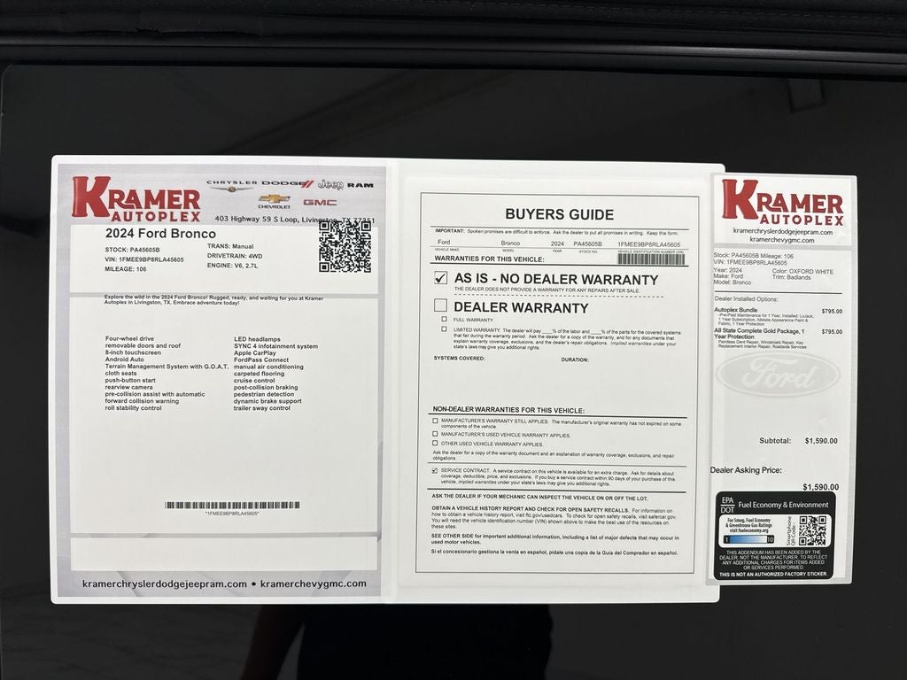 2024 Ford Bronco Badlands — 225 miles — Livingston, TX. This rugged, low-mileage Ford Bronco Badlands is ready to conquer trails and city streets with a powerful 2.7L V6 gasoline engine and dependable 4WD. With just 225 miles on the odometer, this pre-owned Ford Bronco delivers like-new condition at the best price you'll find in the area. Comfort and convenience features include heated seats for chilly mornings, remote start for quick climate control, and Android Auto for seamless smartphone integration. Safety and visibility are covered by a back-up camera, and the vehicle comes with a CARFAX Clean Report for extra peace of mind. The Badlands trim enhances off-road capability with advanced suspension and rugged styling while still offering refined interior touches. Whether you're planning weekend adventures or daily driving, this Ford Bronco balances performance, comfort, and technology. Located in Livingston, TX, this low-mileage Ford Bronco represents exceptional value compared to higher-mileage or higher-priced alternatives. Act quickly — a 2024 Ford Bronco Badlands with 225 miles, 4WD, and a V6 at this price won't last long. Contact us in Livingston, TX to schedule a test drive, request the CARFAX, or get a fast financing quote. Drive home confidence and capability today.
