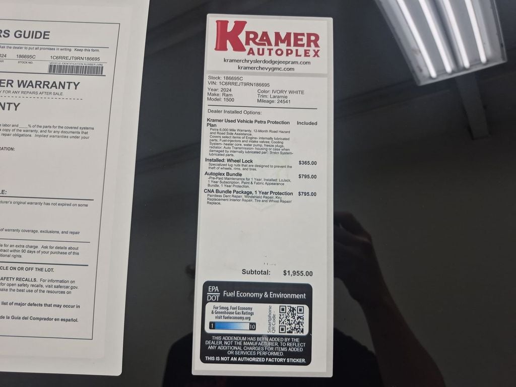 Quick Order Package 27H Laramie. Laramie Level B Equipment Group: Google Android Auto; SiriusXM Radio Service; USB Host Flip; Rear Window Defroster; Blind Spot and Cross Path Detection; Rain Sensitive Windshield Wipers; ParkSense Front/rear Park Assist with Stop; Power Adjustable Pedals with Memory; For Details. Visit DriveUconnect.com; For More Info. Call 800-643-2112; Rear Power Sliding Window; Integrated Voice Command with Bluetooth®; Connectivity - US/Canada; GPS Navigation; 4G LTE Wi-Fi Hot Spot; Rear Underseat Compartment Storage; SiriusXM with 360L; Global Telematics Box Module; Connected Travel and Traffic Services; Front LED Fog Lamps; Heated Second Row Seats; LED Reflector Headlamps; Foam Bottle Insert (door Trim Panel); Apple CarPlay; HD Radio; Uconnect 5 Navigation with 12.0" Display Radio; Rear 60/40 Folding Split Recline Seat; Remote Tailgate Release; Harman/kardon 19 Speaker Premium Sound; Auto High Beam Headlamp Control; Front Door Accent Lighting; 2nd Row in Floor Storage Bins; Rear Door Accent Lighting. Night Edition: Leather Trimmed Bucket Seats; Accent Color Premium Power Mirrors; Exterior Mirrors with Supplemental Signals; Black Headlamp Bezels; Sport Performance Hood; Exterior Mirrors Courtesy Lamps; 22" X 9" Forged Aluminum Wheels; Exterior Mirrors with Heating Element; Auto Dim Exterior Driver Mirror; Black Exterior Truck Badging; Anti-Spin Differential Rear Axle; Accent Color Door Handles; Exterior Mirrors with Memory; Black Interior Accents; Dual Exhaust with Black Tips; Power-Folding Mirrors; Body Color Front Bumper; Convex Wide-Angle Exterior Mirror Insert; Grille Surround 3 Black Texture 2 Black; Body Color Rear Bumper with Step Pads; RAM Grille Badge - Black; Black Painted Exterior Mirrors Caps. 22" X 9" Forged Aluminum Wheels. Leather Trimmed Bucket Seats. Ivory White Tri-Coat PC. Anti-Spin Differential Rear Axle. ParkSense Front/rear Park Assist with Stop. Class IV Receiver Hitch. Rear Underseat Compartment Storage. **Equipment listed is based on original vehicle build and subject to change. Please confirm the accuracy of the included equipment by calling the dealer prior to purchase.**
