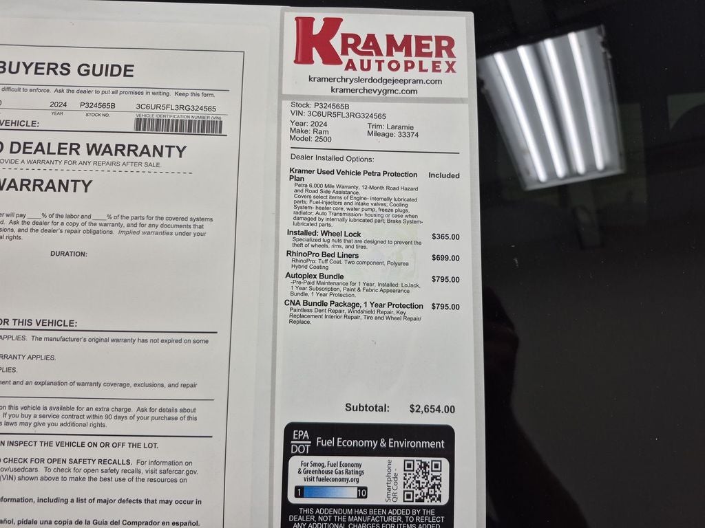 Quick Order Package 2HH Laramie. Laramie Level 1 Equipment Group: Google Android Auto; SiriusXM Radio Service; Blind Spot and Cross Path Detection; LED Tail Lamps; Power Adjustable Pedals with Memory; For Details. Visit DriveUconnect.com; For More Info. Call 800-643-2112; Integrated Voice Command with Bluetooth®; 12" Touchscreen Display; Auto Power-Folding Mirrors; Front LED Fog Lamps; Mirror Running Lights; Alexa Built-In; Apple CarPlay; Power Adjustable Convex Aux Mirrors; Forward and Reverse Utility Lights; Disassociated Touchscreen Display; Remote Tailgate Release; Center Hub; 2nd Row in Floor Storage Bins; Rear Window Defroster; Rain Sensitive Windshield Wipers; Rear Power Sliding Window; Connectivity - US/Canada; GPS Navigation; 4G LTE Wi-Fi Hot Spot; GPS Antenna Input; Exterior Mirrors with Heating Element; Auto Dim Exterior Mirror; SiriusXM with 360L; Global Telematics Box Module; Connected Travel and Traffic Services; LED Reflector Headlamps; Foam Bottle Insert (door Trim Panel); 18" X 8.0" Polished Aluminum Wheels; Off-Road Information Pages; Selectable Tire Fill Alert; Trailer Tow Pages; HD Radio; Uconnect 5 Navigation with 12.0" Display Radio; Power Heated Fold Telescopic Mirrors with Memory; Exterior Mirrors with Supplemental Signals; Exterior Mirrors Courtesy Lamps; Auto High Beam Headlamp Control; Chrome Exterior Mirrors; Exterior Mirrors with Memory; Power Adjust Mirrors; Power Telescoping Mirrors; Auto Dim Exterior Passenger Mirror; Auto Adjust in Reverse Exterior Mirrors; ParkSense Front/rear Park Assist System. Blind Spot and Cross Path Detection. LT275/70R18E OWL On/off Road Tires. Billet Silver Metallic CC. Tow Hooks. **Equipment listed is based on original vehicle build and subject to change. Please confirm the accuracy of the included equipment by calling the dealer prior to purchase.**
