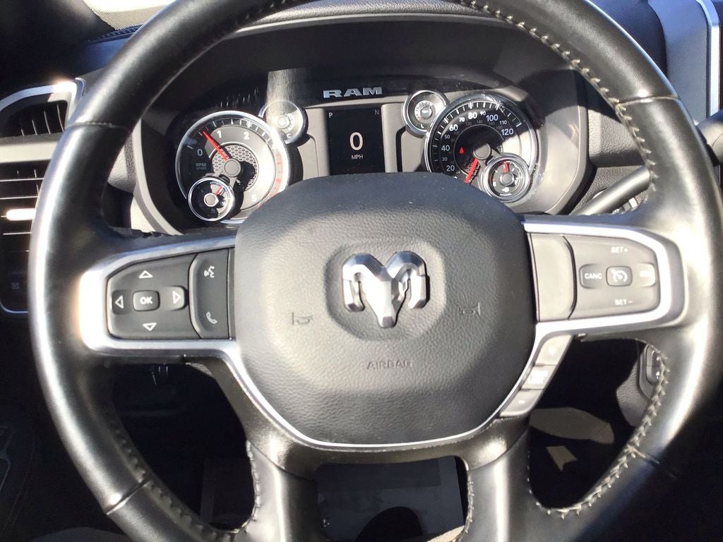 Quick Order Package 2HZ Big Horn. Level 1 Equipment Group: Leather Wrapped Steering Wheel; Rear Dome with On/off Switch Lamp; Front Fog Lamps; Premium Cloth 40/20/40 Bench Seat; Glove Box Lamp; Auto Power-Folding Mirrors; Footwell Courtesy Lamp; Exterior Mirrors with Heating Element; Mirror Running Lights; Uconnect 5 with 8.4" Display Radio; Foam Bottle Insert (door Trim Panel); Black Exterior Mirrors; 18" X 8.0" Polished Aluminum Wheels; Big Horn Instrument Panel Badge; Power-Adjustable Convex Aux Mirrors; Forward and Reverse Utility Lights; Locking Lower Glove Box; Power Heated Fold Telescopic Mirrors; Exterior Mirrors with Supplemental Signals; Steering Wheel Mounted Audio Controls; Exterior Mirrors Courtesy Lamps; Dual Glove Boxes; Center Hub; Power Adjust Mirrors; 2nd Row in Floor Storage Bins; Power Telescoping Mirrors. Quick Order Package 2GZ Big Horn. Premium Cloth 40/20/40 Bench Seat. Uconnect 5 with 8.4" Display Radio. Chrome Flat Cab-Length Side Steps. MOPAR Spray in Bedliner. 5th Wheel/gooseneck Towing Prep Group. Front Fog Lamps. Power 2-Way Driver Lumbar Adjust. **Equipment listed is based on original vehicle build and subject to change. Please confirm the accuracy of the included equipment by calling the dealer prior to purchase.**